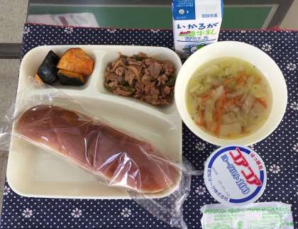 12月19日(水)、今日の給食の献立は、『豚肉のケチャップソテー・はくさいのスープ・焼きかぼちゃ・ヨーグルト・黒糖パン・牛乳』です。