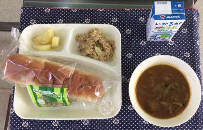 1月8日(火)、今日の給食の献立は、『ミートボールと野菜のカレー煮・ツナとキャベツのソテー・焼きじゃが・まっ茶大豆・パン・牛乳』でした。