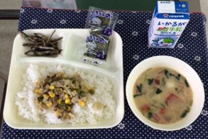 1月9日(水)、今日の給食は、正月の行事献立で、『れんこんのちらしずし・ぞう煮・ごまめ・米飯・牛乳』でした。