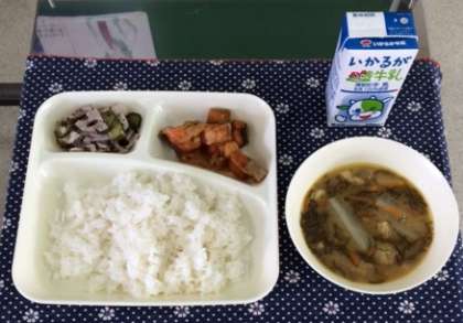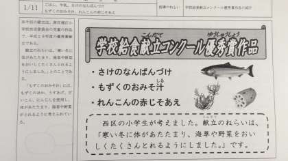 1月11日(金)、今日の給食の献立は、児童・生徒の「学校給食献立作品コンクール最優秀作品」『さけのなんばんづけ・もずくのおみそ汁・れんこんの赤じそあえ・米飯・牛乳』でした。