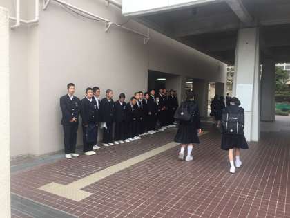 寒い中、野球部の生徒が正門であいさつ運動をしています。