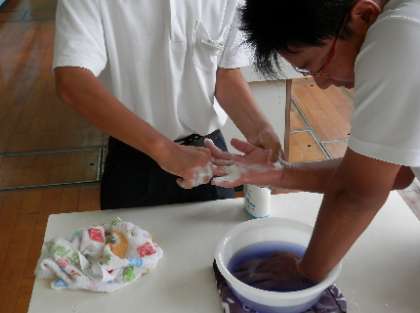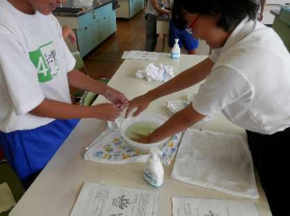 学校元気アップ支援員さんによるチャレンジ講座第2弾として、ハンドマッサージ講座をしていただきました。心身のリラックス効果があるハンドマッサージを実践してみようというテーマで二人一組になり、ぬるま湯に手を入れながら、ハンドソープを使いながら、手の甲や手の平のツボを押さえることでストレス緩和につながる体験をしました。