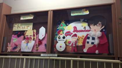 1月30日(水)、美術部の『2月ディスプレイ』が製作され、新館西階段踊り場に設置されました。