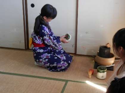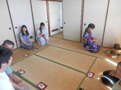 平和登校日の後、午後から茶道部によるお茶会が開催されました。本館4階の和室で、茶道部が作ったお茶菓子(ういろう)と一緒にお点前が披露されました。