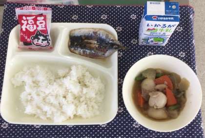 2月5日(火)、今日の給食は、節分の行事献立で、『いわしのしょうがじょうゆかけ・含め煮・いり大豆・米飯・牛乳』でした。