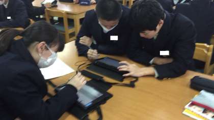 2年5日(火)、3年生の社会科授業では、班ごとに、タブレット端末を活用し、調べ学習を行っています。