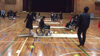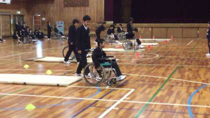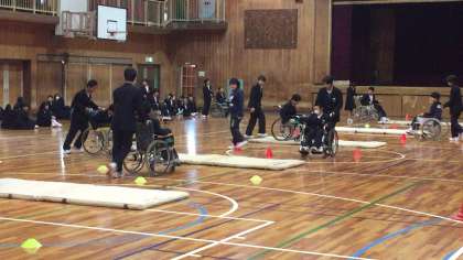 2月6日(水)6限、1年生は、2月12日(火)1・2限に実施予定の『パラリンピックキャラバン』の事前学習として、『車いす体験』を行いました。