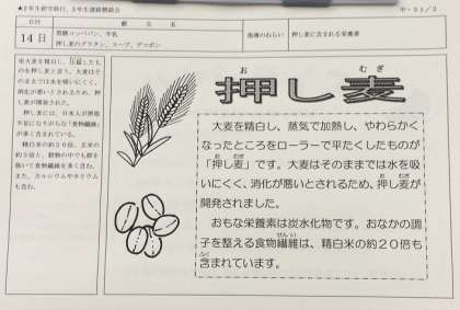 2月14日(木)、今日の給食は1年生のみ実施で、『押し麦のグラタン・スープ・デコポン・パン・牛乳』でした。