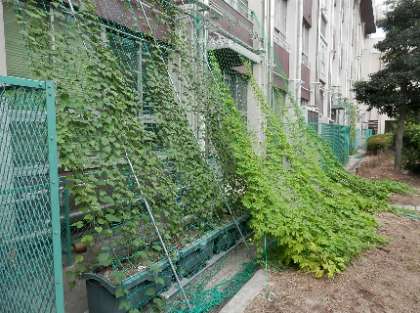 夏に大きく成長するのは、生徒だけではなく、植物も同じです。保健室前の朝顔やゴーヤの緑のカーテンが、しっかりした影を作り出すようになってきました。