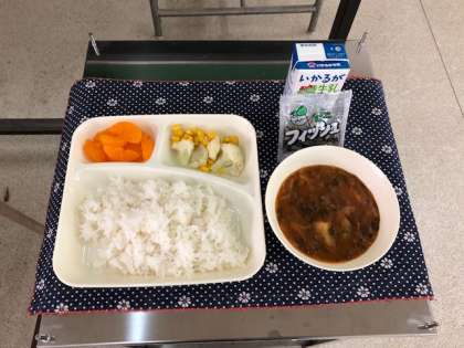 2月15日(金)、今日の給食は1年生のみ実施で、献立は、『ハヤシライス・カリフラワーとコーンのサラダ・みかん(缶)・ミニフィッシュ・米飯・牛乳』です。