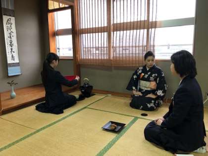 2月15日(金)放課後、本校作法室で、茶道部は、技術指導者の先生をお招きして、1年生が、『盆略手前』の練習をしました。