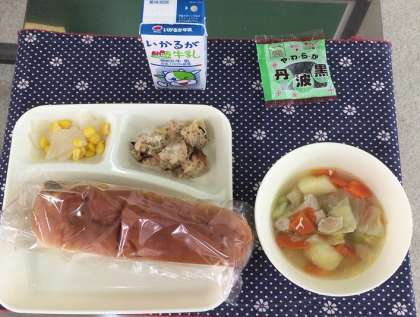 2月20日(水)、今日の給食の献立は、『まぐろのしょうゆマヨネーズ焼き・鶏肉とじゃがいものスープ煮・だいこんのサラダ・ソフト黒豆・パン・牛乳』でした。