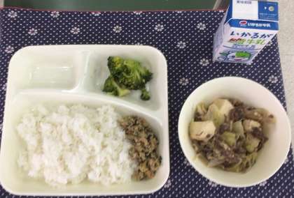 明日は、『豚肉とはくさいのうま煮・あつあげのピリ辛じょうゆかけ・いちご・パン・牛乳』の予定です。