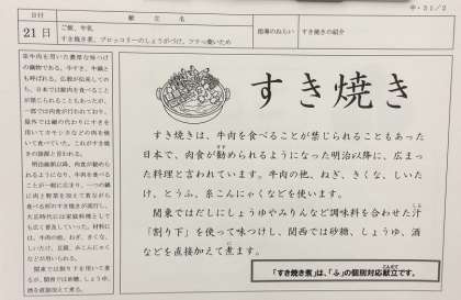 2月21日(木)、今日の給食の献立は、『すき焼き煮・ブロッコリーのしょうがづけ・ツナっ葉いため・米飯・牛乳』でした。