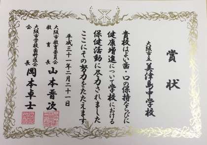 2月21日(木)14時より、大阪府歯科医師会館で開催された大阪市学校歯科保健研究大会で、本校は、昨年度に続き、今年度も『よい歯の学校』として表彰されました。