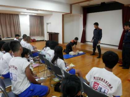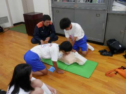 午後1時30分より、淀川消防署の協力により、各学年の防災リーダーのメンバーが、大会議室で「普通救急救命講習」を受講しました。「目の前で倒れている人を見かけたときにその場に居合わせた人で何ができるのか?」「何をしなければならないのか」ということについて、中学生としてその場でとれる行動があるはず。助けらえる人ではなくて、助ける人になること、役立つ人になることを目指して、これからも学習していきます。