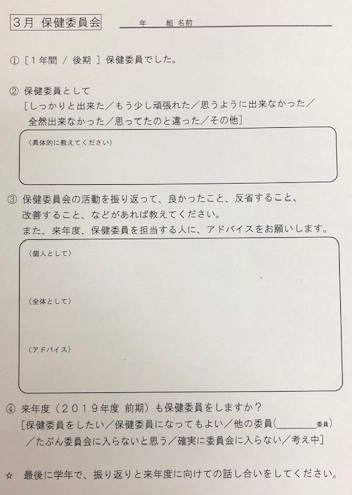 写真上中段は、保健委員会の活動の様子と振り返りシートです。写真下段は、体育委員会の活動の様子です。