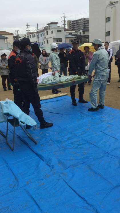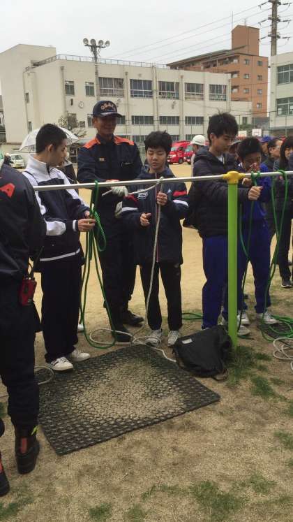 写真は、救出訓練(ロープワーク)と応急手当訓練(応急手当・負傷者搬送)の様子です。