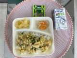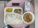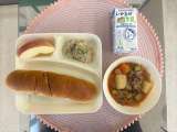 ミートボールと野菜のカレー煮 ツナとこまつなのソテー パインアップル パン 牛乳...