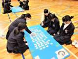 太鼓の合図の後、読み手が札を読み始めると取り札にみんなの視線が集まります。