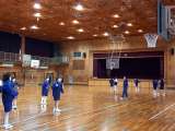 体育館では、1年生がバスケットボールのシュート練習を行っています。