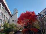 青空に真っ赤に染まった木々が映えています。桜の木は、ほぼ葉が散り冬に備えています...
