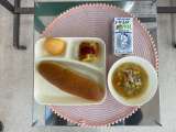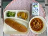 ツナポテトオムレツ ケチャップ スープ 白桃 パン 牛乳 オムレツは、卵に塩、こ...