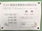 1・2年生は、本日より学年末テスト1週間前となります。来週火曜日までの4日間は、...