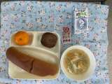 焼きハンバーグ ケチャップ 豆乳スープ パン 牛乳