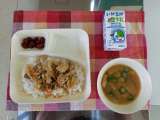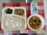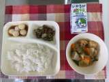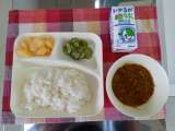 大豆入りキーマカレーライス きゅうりのピクルス 白桃 牛乳 キーマカレーライス:...