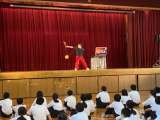本日午後、2部制に分けて体育館でパフォーマーのちゃんへんさんを招いて芸術鑑賞を行...