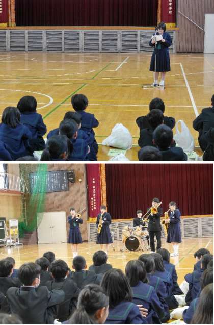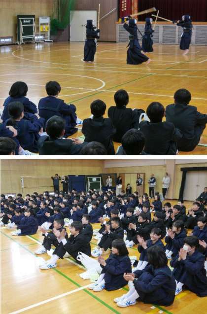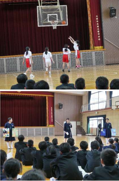 手芸部、吹奏楽部、女子バスケットボール部、美術部、剣道部の部活動紹介です。1年生も各部の発表に拍手をして、どの部に入ろうかなと考えながら聞いてくれています。