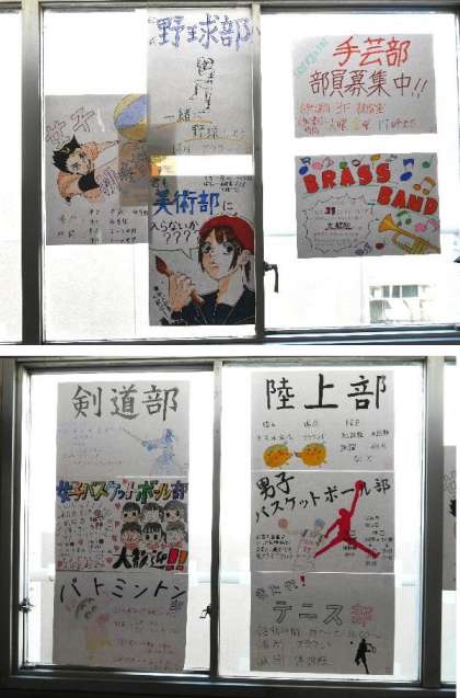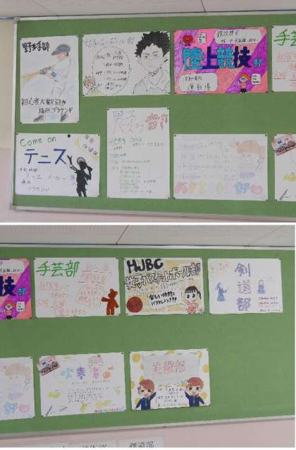 2階の廊下や、1粘性の教室の階に、部活動を紹介するポスターが貼られています。よくできています。