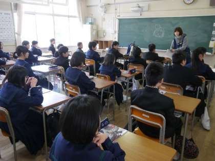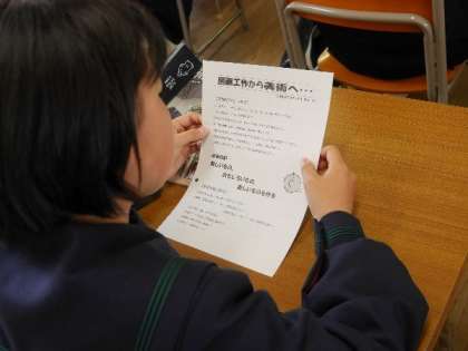 1年生の美術の授業です。小学校では図画工作でしたが、中学校では美術と技術に分かれます。美術の目標は、美しいもの おもしろいもの 新しいものを作る ということです。