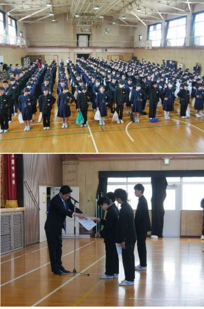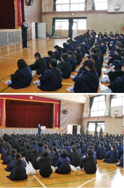 今年から全校集会は体育館で行います。暑い時期や寒い時期など生徒の身体に負担がかからなくなります。また、座って話を聞くことができるので、体力的にも楽になり、話もしっかりと聞くことができます。余裕をもって登校して遅れないようにしましょう。