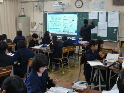 1年生の理科の授業です。プロジェクタには教科書のページが映し出されています。ホワイトボードを使ってグループで話し合ったり、いろいろな機器を使って学習します。