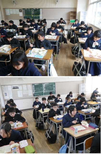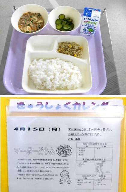 今日の献立は、マーボー豆腐、きゅうりの甘酢づけ、もやしとコーンのごま炒め、ご飯、牛乳でした。とてもごはんがすすむメニューだおいしかったですね。1年生はしっかり食べて元気いっぱいです。