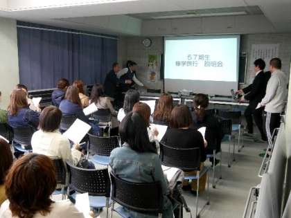 5月の3年生の修学旅行の保護者説明会をおこないました。行程などを写真でみていただき、持ち物などの説明をさせていただきました。