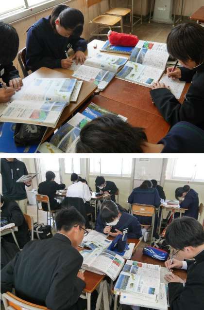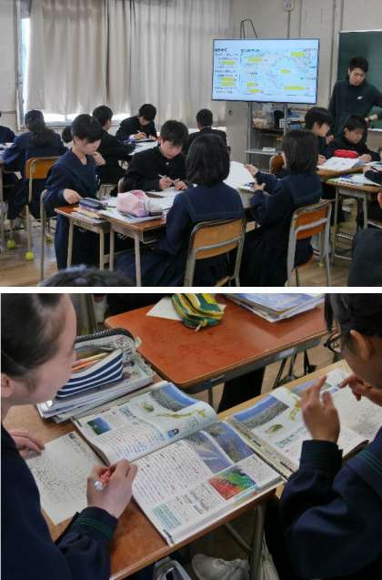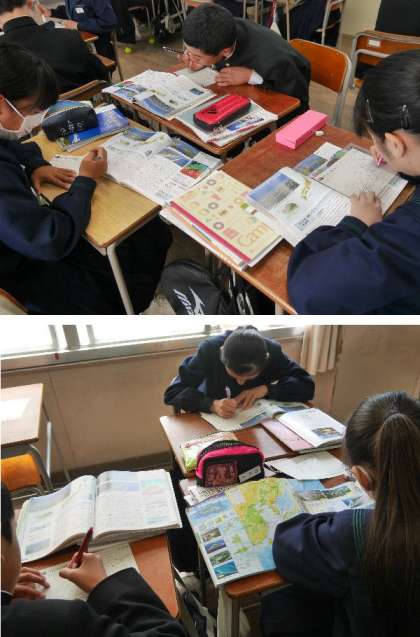 1年生の社会の授業です。班で協力しあって学習に取り組んでいます。しっかりと取り組めていますね。