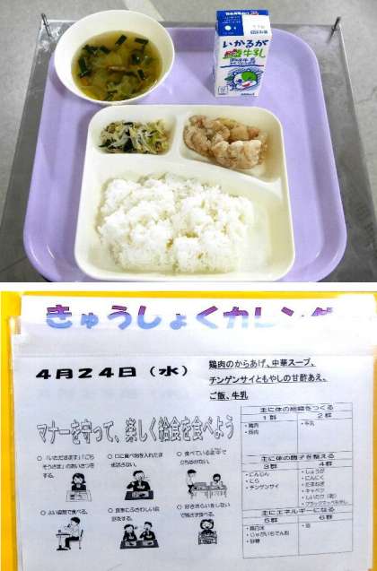今日の献立は、ご飯、牛乳、鶏肉のからあげ、中華スープ、チンゲンサイともやしの甘酢あえでした。からあげが人気でした。今日もよくご飯をたべました。おいしかったですね。