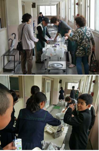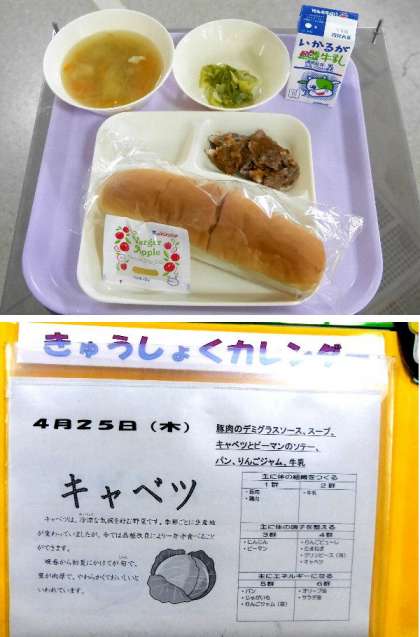今日の献立は、パン、牛乳、豚肉のデミグラスソース、スープ、キャベツとピーマンのソテー、りんごジャムでした。今日もたくさんの元気アップボランティアさんにきていただきました。ありがとうございます。
