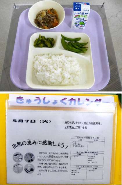 今日の献立は、ご飯、牛乳、肉じゃが、きゅうりのかつお梅風味、えだまめでした。