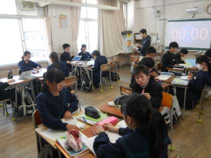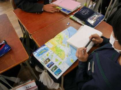 2年生の社会では、簡易日本地図をノートに描く練習をしていました。以外と難しいし、日本地図の輪郭がなかなか把握できていない生徒も多いです。天気予報ではよくでくくるんですけどね。