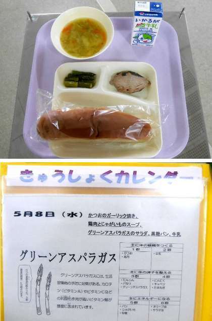 今日の献立は、黒糖パン、牛乳、かつおのガーリック焼き、鶏肉とじゃがいものスープ、グリーンアスパラガスのサラダでした。