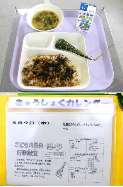 今日の献立は、こどもの日にちなんだ行事献立でした。牛肉のちらしずし、すまし汁、ちまき、牛乳でした。子どもたちに、「ちまき」は人気です。じゃんけんをして残ったちまきを分けていました。あまくておいしいかったです。