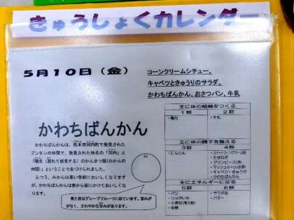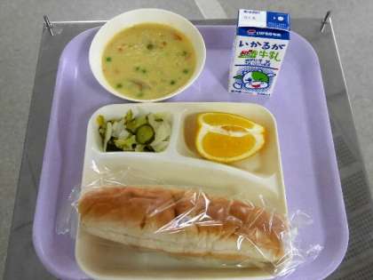 今日の献立は、おさつパン、牛乳、コーンクリームシチュー、キャベツときゅうりのサラダ、かわちばんかんでした。