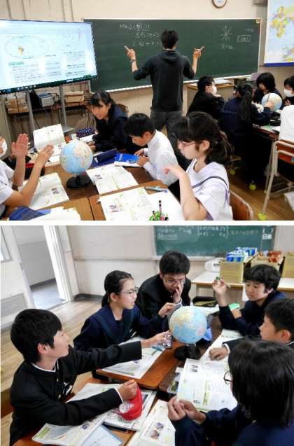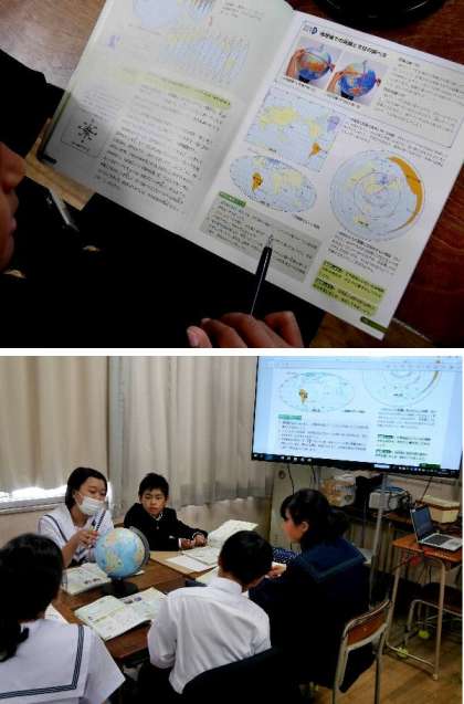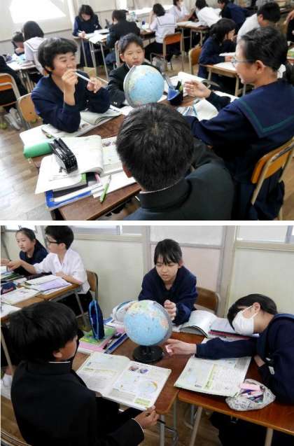 1年生の社会の授業では、地図について学習しています。地図にもいろいろな種類があねんですね。地球儀を使って、大陸の大きさを比べています。