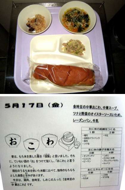 今日の献立は、レーズンパン、金時豆の中華おこわ、中華スープ、ツナと野菜のオイスターソースいため、牛乳でした。