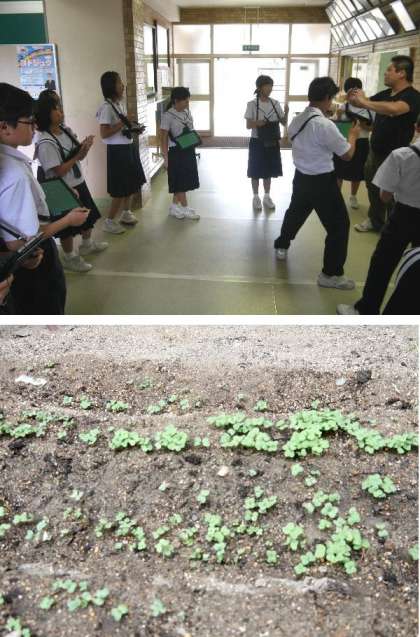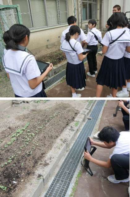 1年生の技術で、生徒たちがタブレットをもって、ラディッシュを観察して写真に記録していました。先週に2年生がまいた種から双葉の芽がでてきました。