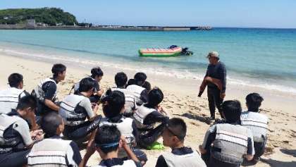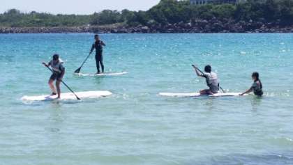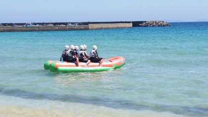 マリンスポーツで、バナナボート、シュノケリング、ビスケットボード、パドルボートを順番に行います。